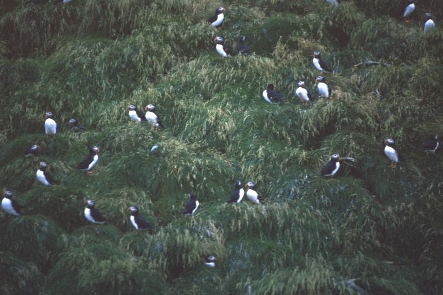 断崖絶壁の無人島(環境保護のため上陸禁止)に近づくに連れ、周りを飛翔するパフィンの姿が増えてきた。セント・キルダ島St.Kildaで見たあのお茶目な姿がよみがえる。島に近づくと崖一面パフィンだらけ。バージン会長もサービスたっぷりでぎりぎりまで近づいてくれる。夢中でシャッターを切りまくった。