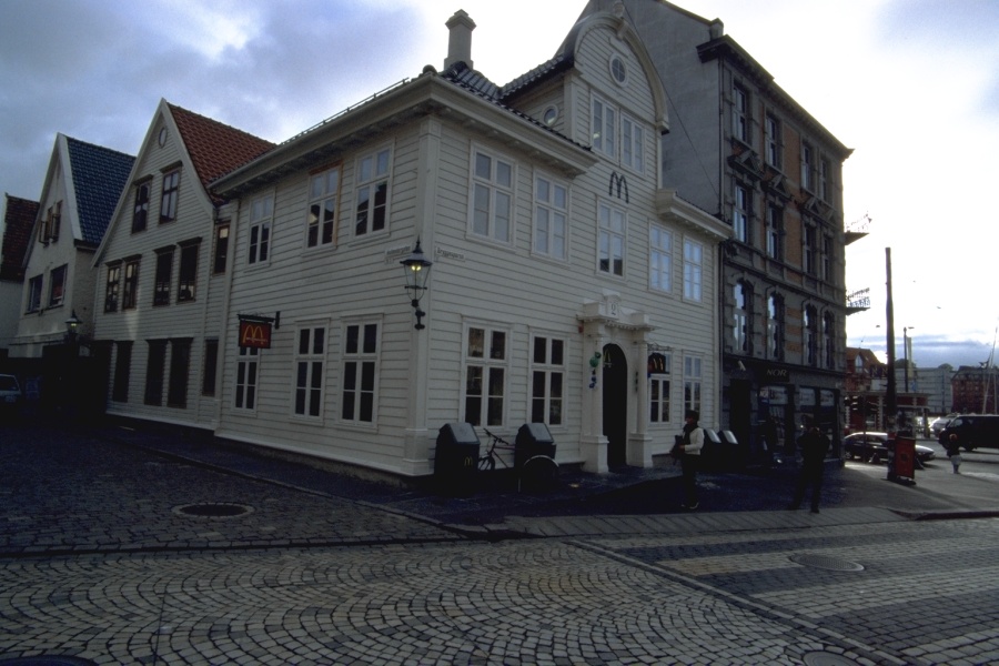 晩ご飯を探して、ブリッゲンに向かう。途中の小さな通りの彩りが、レゴブロックのようで美しい。ブリッゲンの裏通りにあるJCBお薦めのノルウェー料理の店にはいる。世界遺産そのままのようなたたずまいの店で、窓には手作りガラスがはめ込まれ、全て木で出来た壁や骨組みは幾分傾いているような感じを受ける。地ビールを飲みながらのシーフードは格別であった。でもなぜかJCBカードが使えなかったけど。