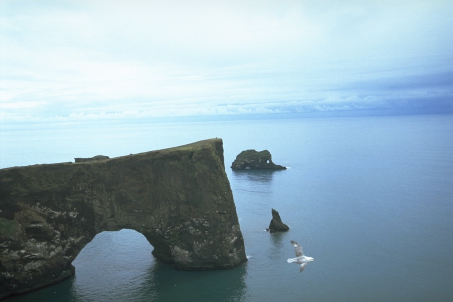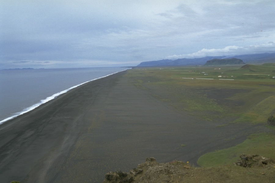 今日はアイスランド最南端のデルホゥラエイ岬Dyrhólaeyまでの行程。最初の景勝地、セーリャランドスフォスの滝Seljalandsfossまでは1号線を東に走る。コケに覆われた鬼押し出し(溶岩平原)が何処までも続く。途中幾つかの町を過ぎる他は全く同じ景色。セルフォスSelfossから75km、遠くに崖が見えてきた。