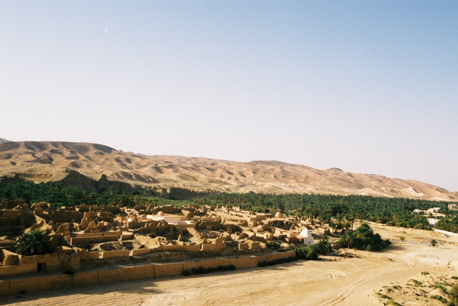 ガフサを過ぎしばらく西へ走った後、トズールに向かう主要道路を離れて山道に入る。周りの風景はもう完全に緑からは見捨てられ、ショッカーが出てきて戦う採石場の跡のような荒れ地が続く。悪路を覚悟していたが、道はきれいに舗装されている。砂漠というと、大きな砂丘がうねうねと地平線まで続く風景を思い浮かべるが、ほとんどの場合、多少の植物が生えた荒れた大地だ。ここはもう完全に砂漠だ。不思議なことに、こんな大地でも数10キロおきに集落がある。遠くで降った雨(ここらあたりだと隣国アルジェリアで降った雨が)地下水となって流れ着き、オアシスを作るそうだ。
