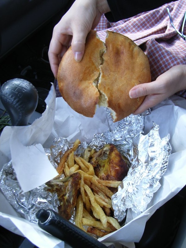 さて、問題の昼飯の時間が迫ってきた。昨日の件があり、妻は「もう何も食べない、100歩譲ってフランスパンのみ」と宣言した。小さな商店が続く通りで車を停め、パン屋を探す。途中、チキンの丸焼きをしている店があった。美味しそうな香りが漂う。パンも売っているので、ここで妥協。チキンを半身とポテトフライのセット、直径25センチくらいの丸くて平べったいパンを買う。車に戻り、しばらく走ったところの木陰で休憩。パンはどっしりとした重みでなかなかの噛み応え。チキンはハーブをからめた香草焼きでなかなかの美味、妻も納得の美味しさ、って食べてるよ。食べないんじゃなかったの?