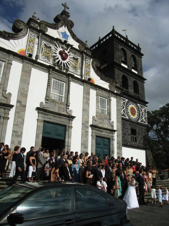 金泥細工が美しい祭壇を背に、式はおごそかに進む。島に来て初日に聞いたファドといい、アソーレスの旅は予期しないアトラクションに恵まれている。時々参列者一同がひざまずいてお祈りを捧げる。ひざまずく時に膝を乗せる台が座席に付いているのは発見だ。式は無事に終わり、新郎新婦は教会の前の石段で出席者に囲まれライスシャワーを浴びる。おめでとう、そしてお幸せに、通りすがりのものですが、お祈りいたします。