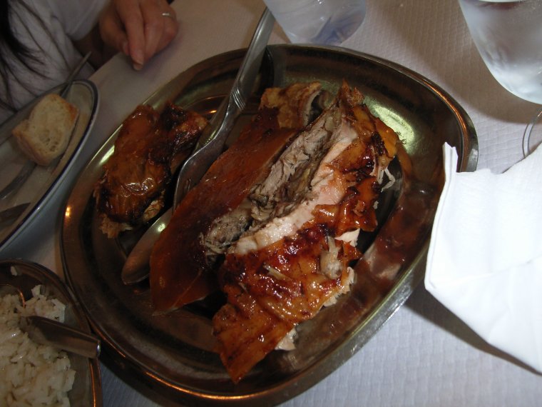 皿に盛られたそれは、まさに豚を焼いただけ、生まれてから母乳しか飲ませていない子豚(乳児豚?)を串刺しにしてじっくりとロースト……なんて残酷な料理だ……して作る。パリパリとした皮とジューシーな肉の取り合わせがたまらない。隣のテーブルの男性が「何処から来たの?日本か。どうだ?ここのレイタオンは最高だろう」と自分のことのように自慢している。わざわざこの町に寄り道して大正解であった。