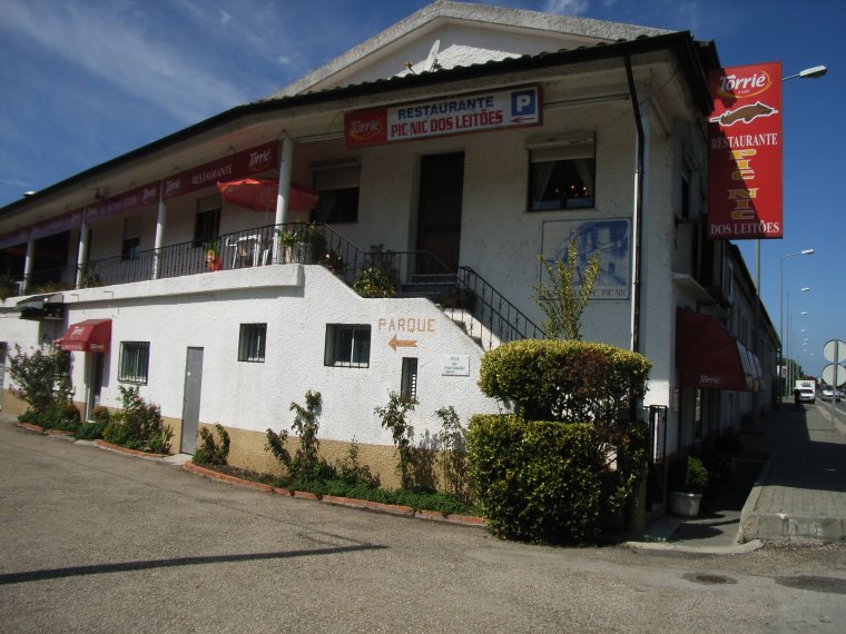 子豚のピクニックRestaurante PIC NIC dos LEITÕES(勝手に意訳)は、道路に面した所に2階建ての店舗があり、奥に結構広い駐車場がある。そして更に奥には“工場”があり、なにやら怪しげな煙が漂っている。店の入り口には既に10数人の列が出来ていたが、10分程度で2階に案内された。
