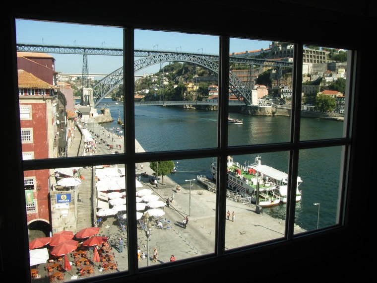 部屋は501号室。民家を改装した建物だそうだが、内部は近代的な作り。唯一面影を残しているのが窓枠。神社の石段に使われるような立派な石で組まれていて、鉄の格子がはめられていた穴が残っている。窓からはドウロ川の観光クルーズ船が発着する船着き場や、正面には